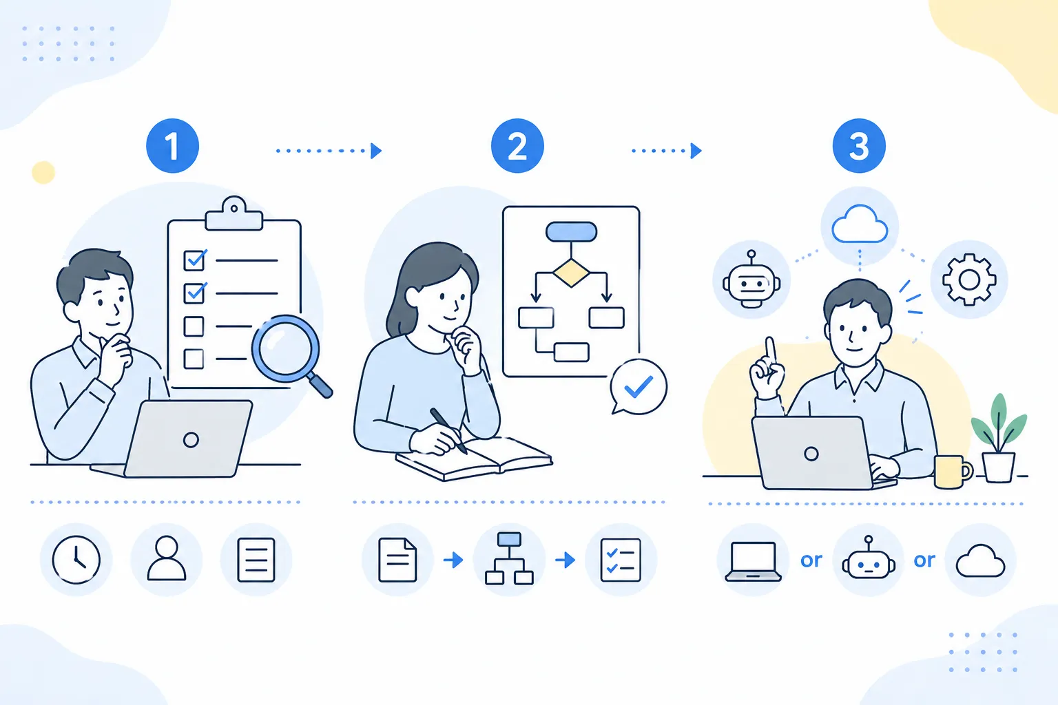 ランキングを見て、「うちのあの業務も自動化できそう」と感じたものがあったかもしれません。では、具体的にどう進めるべきでしょうか。失敗しないための3ステップをご紹介します。