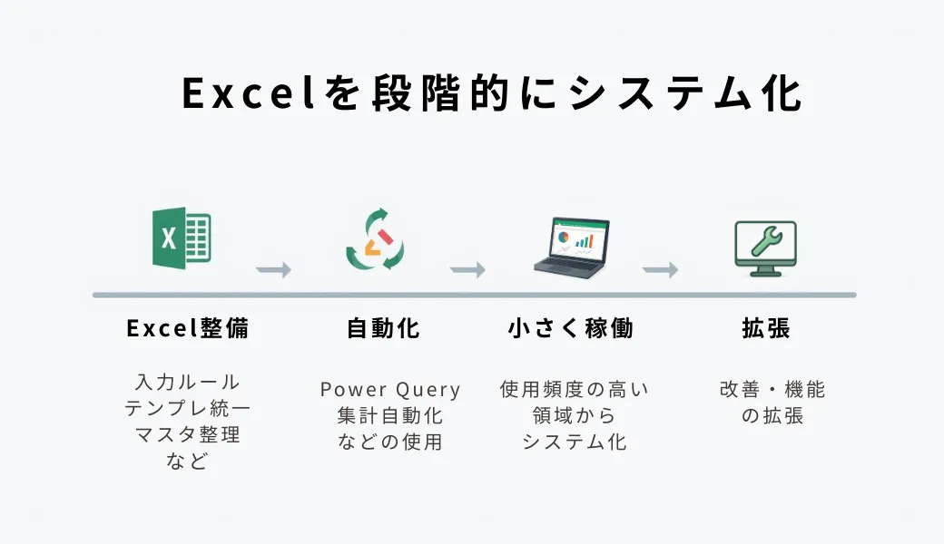 Excelの課題に対して、いきなり全面システム化をすると失敗しやすいです。理由は、要件が固まりきっていない状態で大きく作るほど、現場の例外処理が漏れ、稼働後に「結局Excelに戻る」からです。