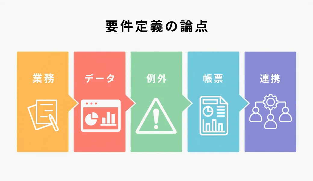 要件定義を「画面の話」だと思うと失敗します。製造業基幹の要件定義は、次の5つを決める作業です。