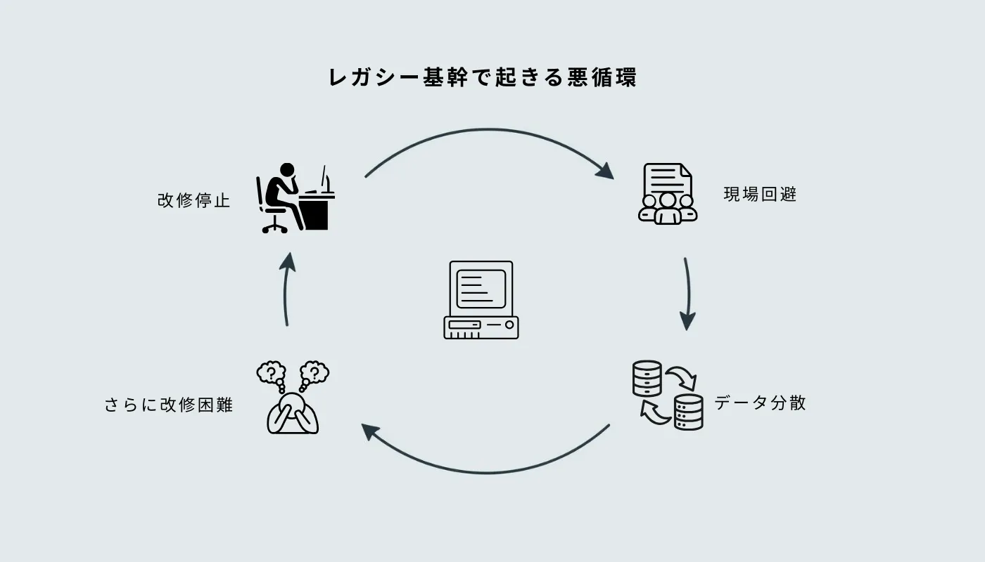 レガシー基幹を使い続ける問題は「古い」こと自体ではなく、現場実態とのズレが広がることです。