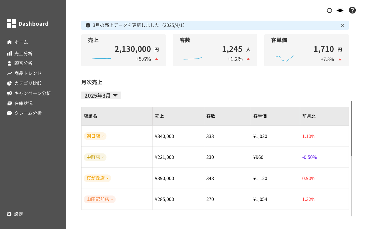 - まずは「売上・客数・客単価・カテゴリ別売上」が毎日見える状態を作るだけでも、